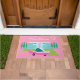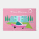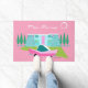 Between the pink background, turquoise mid century modern home, and the classic 1950s car, this design couldn’t be more Palm Springs if it said it in the clouds. Oh, wait, it does say it in the clouds! The blue and teal stone of the house is offset by the sputnik light fixtures framing the hot pink door. This kitschy, retro design welcomes you to live your most fabulous life.