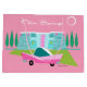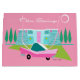 Between the pink background, turquoise mid century modern home, and the classic 1950s car, this design couldn’t be more Palm Springs if it said it in the clouds. Oh, wait, it does say it in the clouds! The blue and teal stone of the house is offset by the sputnik light fixtures framing the hot pink door. This kitschy, retro design welcomes you to live your most fabulous life.