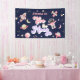 This space birthday banner features retro 70s text, pink and purple colours and space illustrations. The illustrations are planets, stars and a rocket ship. The background is space navy blue making this the perfect banner to celebrate your little astronaut.