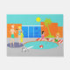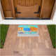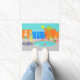Come on in! The water is fine! This Retro Pool Party Door Mat features a vibrant, cartoon drawing of a fun and sophisticated pool party. The mid century modern design centres around a round swimming pool on a large, grey, concrete patio. The pool is filled with turquoise water. Orange brickwork surrounds the pool and there is a white, plank diving board all ready for an adventurous soul. A red and white beach ball is floating in the water. On the opposite side of the pool, two party-goers are dangling their feet in the water, while resting on red and white striped beach towels. The woman with black hair is wearing a pink, one-piece swimsuit. Beside her is a tropical drink in a coconut with a little umbrella and a green straw. The blonde man is wearing bright, green trunks. He is kicked backed with his hands behind his head. To the left of the pool, is a distinguished man with white hair and jade swim trunks holding a drink in a coconut shell. We know he's distinguished because he's a man with white hair! He is talking to a woman with blonde hair and an hourglass figure wearing a turquoise swimsuit. Slung across her arm is a yellow beach towel. Behind this scene is the green silhouette of a palm tree and a futuristic, orange, brick house. Through the large, floor to ceiling, blue glass windows, you can see the silhouette of a television, chair, ottoman, and starburst clock. The sky behind the house is a cloudless turquoise with a round, yellow sun. The opposite side of the pillow features an orange brick pattern.