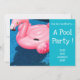 A party invitation for a pool party featuring a retro hip, cool graphic of a large blow up flamingo pool toy in bright and vibrant colours of pink and blue. The text on this invitation is fully customisable to include your own personal details.