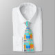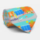 Come on in! The water is fine! This Retro Pool Party Tie features a vibrant, cartoon drawing of a fun and sophisticated pool party. The mid century modern design centres around a round swimming pool on a large, grey, concrete patio. The pool is filled with turquoise water. Orange brickwork surrounds the pool and there is a white, plank diving board all ready for an adventurous soul. A red and white beach ball is floating in the water. On the opposite side of the pool, two party-goers are dangling their feet in the water, while resting on red and white striped beach towels. The woman with black hair is wearing a pink one-piece swimsuit. Beside her, is a tropical drink in a coconut with a little umbrella and a green straw. The blonde man is wearing bright green trunks. He is kicked back with his hands behind his head. To the left of the pool, is a distinguished man with white hair and jade swim trunks holding a drink in a coconut shell. We know he's distinguished because he's a man with white hair! He is talking to a woman with blonde hair and an hourglass figure wearing a turquoise swimsuit. Slung across her arm is a yellow beach towel. Behind this scene is the green silhouette of a palm tree and a futuristic orange, brick house. Through the large, floor to ceiling, blue glass windows, you can see the silhouette of a television, chair, ottoman, and starburst clock. The sky behind the house is a cloudless turquoise with a round, yellow sun.
