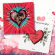 Personalised Valentine's Day card with a retro pop art red, blue and yellow heart. This card can be for him or her. The heart is in a gothic tattoo style on the back. You can add your favourite photo and your names in the personalise area.