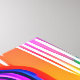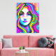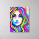 Canvas in a retro, semi abstract portrait of a woman surrounded with long hair in bright, psychedelic, rainbow colours