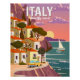 Retro Poster Italy, Mediterranean romantic landscape, road, car, mountains, seaside town, sailboat, sea. Retro travel poster postcard illustration