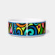 Create a custom made ceramic pet bowl for your cat or dog. Retro Psychedelic 60s Pattern Fun & Colourful Personalised Dog or Cat Pet Bowl. Give your "best friend" a customised food and water bowl or great as a gift for another animal lover. Pet accessories can add a decorative touch to any room. Choose a small or large size bowl.