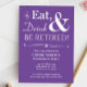 Invite friends and family to help you celebrate your retirement with this funky retro white on purple blue Eat, Drink & Be Retired! party invitation.