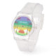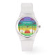 Modern colorful personalised watch with retro style sunset and palm trees art.