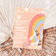 Celebrate your little ones milestone with this retro rainbow first birthday invitation. Featuring pastel colours, peace signs, daisies, roller skates, and sparkles, it sets a fun and nostalgic vibe. Perfect for a groovy party theme, this customisable card makes inviting guests easy and stylish. Spread peace, love, and joy with a unique design that captures the magic of childhoods first big celebration.