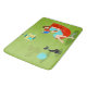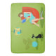 This Retro Reading Woman Bath Mat features a 1960's style, minimalist art, cartoon drawing of a woman who has her priorities in order. This delightful bookworm is entranced in a real page-turner. The shapely brunette is wearing an aqua dress and red glasses, while holding a blue book. She is seated in a comfy, red egg chair. In front of her, a sleek, black cat in a teal collar is enjoying the peace and quiet that comes from living with a bibliophile. Both woman and cat are in a stylish green room. Overhead, there is a kitschy pendant lamp in shades of yellow and turquoise. To the side, there is a lush, tropical, potted plant in an aqua flowerpot. Kitty, if you need something, you'll have to wait until she finishes this chapter!