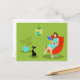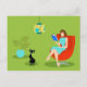 This Retro Reading Woman Postcard features a 1960's style, minimalist art, cartoon drawing of a woman who has her priorities in order. This delightful bookworm is entranced in a real page-turner. The shapely brunette is wearing an aqua dress and red glasses, while holding a blue book. She is seated in a comfy, red egg chair. In front of her, a sleek, black cat in a teal collar is enjoying the peace and quiet that comes from living with a bibliophile. Both woman and cat are in a stylish green room. Overhead, there is a kitschy pendant lamp in shades of yellow and turquoise. To the side, there is a lush, tropical, potted plant in an aqua flowerpot. Kitty, if you need something, you'll have to wait until she finishes this chapter!