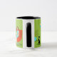 This Retro Reading Woman Ringer Mug features a 1960's style, minimalist art, cartoon drawing of a woman who has her priorities in order. This delightful bookworm is entranced in a real page-turner. The shapely brunette is wearing an aqua dress and red glasses, while holding a blue book. She is seated in a comfy, red egg chair. In front of her, a sleek, black cat in a teal collar is enjoying the peace and quiet that comes from living with a bibliophile. Both woman and cat are in a stylish green room. Overhead, there is a kitschy pendant lamp in shades of yellow and turquoise. To the side, there is a lush, tropical, potted plant in an aqua flowerpot. Kitty, if you need something, you'll have to wait until she finishes this chapter!