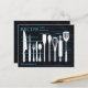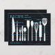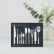 A card with brown lines, stripes placed on white surface with personalised background retro recipe on front postcard. It is customised with your initial and name.