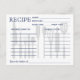 A card with blue lines, stripes placed on white surface with personalised background retro recipe on front postcard. It is customised with your initial and name.