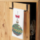 Vintage illustration Merry Christmas holiday party design featuring red and green round hanging glass ornaments. They are decorated with yellow decorative swirls, stripes and diamond shapes. Classic retro 50s kitsch.