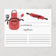 Fun retro bridal shower kitchen recipe cards featuring a red polka dot apron with kitchen tools & rolling pin. The front of our recipe card offers room for a recipe title, from the kitchen of and ingredients space. Flip our recipe card over to view our lined back for recipe directions. Visit our shop for matching bridal shower invitations Available in our shop in a large assortment of popular wedding shower colours. Perfect bridal shower invitation insert for a stock the kitchen bridal shower.