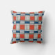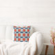 This throw pillow features a retro geometric pattern in red, blue and light grey.