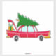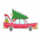 Vinyl decal with a cool old red car carrying a green christmas pine tree on its roof and a present tucked away in the open trunk.