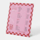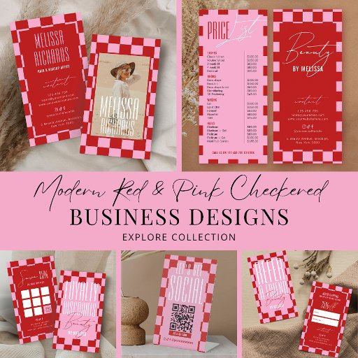 Retro Pink & Red Business Price List Pedestal Sign with trendy checkered background, bold fonts and modern layout. This groovy pink pricing menu table sign includes space for your price list of services, business name or logo and contact details - you can edit all text and colors to suit your brand. This fully editable feminine menu signage is perfect to use as a price list for your beauty salon, nail spa, makeup artist studio or any other professional services.