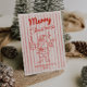 If you are looking for a simple minimalist beautiful and easy editable non photo Christmas card. This one is perfect for you. And as you see the design features a red hand made and drawn Christmas Santa Claus with a champagne glass and bottle, With whimsical red hand written typography of MERRY CHRISTMAS. All on light watercolor red stripes. And your family name and year at the bottom. And In the back you got a a customisable Christmas greeting paragraph and bow.