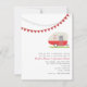 A wedding rehearsal dinner invitation featuring an illustration of a red vintage trailer with a window box full of daisies and black eyed susans. Red and grey bunting at top. Personalise the text.