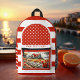 Red and white backpack featuring a retro striped design with polka dots and your custom photo (optional; you can also leave the landscape with red poppies if you like). Beautiful for travel or school.