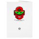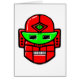 A robot head in red with a stylish green crescent shaped eye panel, a green third eye, with white teeth and highlights. He has a kind of odd sort of grin like he's discovered the wonders of some revolutionary new motor oil. From an original vector drawing by N.A. Berry. The card ahs been left blank inside.