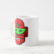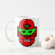 A robot head in red with a stylish green crescent shaped eye panel, a green third eye, with white teeth and highlights. He has a kind of odd sort of grin like he's discovered the wonders of some revolutionary new motor oil. From an original vector drawing by N.A. Berry.