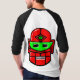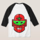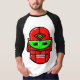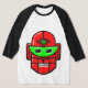 A robot head in red with a stylish green crescent shaped eye panel, a green third eye, with white teeth and highlights. He has a kind of odd sort of grin like he's discovered the wonders of some revolutionary new motor oil. From an original vector drawing by N.A. Berry. The motif is repeated on both the back and the front.