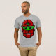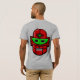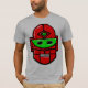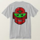 A robot head in red with a stylish green crescent shaped eye panel, a green third eye, with white teeth and highlights. He has a kind of odd sort of grin like he's discovered the wonders of some revolutionary new motor oil. From an original vector drawing by N.A. Berry. The motif is repeated on both the back and the front.