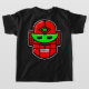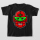 A robot head in red with a stylish green crescent shaped eye panel, a green third eye, with white teeth and highlights. He has a kind of odd sort of grin like he's discovered the wonders of some revolutionary new motor oil. From an original vector drawing by N.A. Berry. The motif is repeated on both the back and the front.