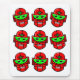 Nine robot heads in red with a stylish green crescent shaped eye panels, green third eyes, with white teeth and highlights. They all have a kind of odd sort of grin as if they are singing a song about motor oil. From an original vector drawing by N.A. Berry.