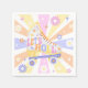 A fun pastel design featuring a white roller skate with the text 'Let's Roll' upon a rainbow burst background with daisies. This design features a pink, orange, yellow and purple colour palette. See the whole matching party collection.