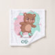 This personalised kids' wash cloth features a chubby baby bear gliding joyfully on tiny retro roller skates, leaving behind a sparkly, magical trail. This playful design is infused with a nostalgic 80s/90s aesthetic and has a soft neon pink and mint green background.