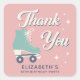 Cute blush pink sticker for her roller skating birthday party featuring "Thank You" in a 70's style script and a retro-inspired illustration of a teal blue roller skate. Personalise with her name in simple dark teal blue typography.