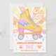 A fun and bright retro inspired roller skate design in the colour palette pastel pink, orange, purple and yellow. On the front is a yellow roller skate and the text 'Let's Roll' in a retro script with a sun burst behind it, and on the back is a fun bright pattern of roller skates. Customise the details for your party! See the whole matching party collection.