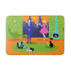 This Retro Romantic Evening Couple Bath Mat looks like a scene out of a 1960's romantic comedy. The minimalist design features an attractive cartoon couple in the living room of a mid century modern, urban apartment. The room prominently features a green, stone wall with a floor to ceiling window with a view. Through the window, we can see the blue silhouette of a big city skyline. A crescent moon is just visible in the orange sky of sunset. The furnishings in the room include a green, lounge chair with matching footstool, a yellow, sputnik light fixture, and a turquoise, cone shaped fireplace, complete with roaring fire. In the centre of the orange flooring, there is a round, green shag rug. A portable, turquoise and black record player is placed on the rug. Next to the record player, a vinyl record can be seen poking out of a kitschy album cover. Also on the rug, there is a sleek, black cat wearing a teal collar. This fancy feline is sitting in front of a martini glass. Enjoying this scene, we have a very sophisticated couple. There is a suave man wearing a blue suit, light blue shirt and red tie. The tall, dark and handsome man is enjoying the company of an elegant blonde woman. The lovely lady is wearing a hot pink dress with a form fitting bodice and flared skirt. They are each holding a crystal martini glass with a floating olive. Cheers! Here's to the perfect evening at home!