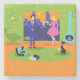 This Retro Romantic Evening Couple Stone Coaster looks like a scene out of a 1960's romantic comedy. The minimalist design features an attractive cartoon couple in the living room of a mid century modern, urban apartment. The room prominently features a green, stone wall with a floor to ceiling window with a view. Through the window, we can see the blue silhouette of a big city skyline. A crescent moon is just visible in the orange sky of sunset. The furnishings in the room include a green, lounge chair with matching footstool, a yellow, sputnik light fixture, and a turquoise, cone shaped fireplace, complete with roaring fire. In the centre of the orange flooring, there is a round, green shag rug. A portable, turquoise and black record player is placed on the rug. Next to the record player, a vinyl record can be seen poking out of a kitschy album cover. Also on the rug, there is a sleek, black cat wearing a teal collar. This fancy feline is sitting in front of a martini glass. Enjoying this scene, we have a very sophisticated couple. There is a suave man wearing a blue suit, light blue shirt and red tie. The tall, dark and handsome man is enjoying the company of an elegant blonde woman. The lovely lady is wearing a hot pink dress with a form fitting bodice and flared skirt. They are each holding a crystal martini glass with a floating olive. Cheers! Here's to the perfect evening at home!