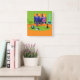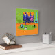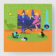 This Retro Romantic Evening Couple Acrylic Wall Clock looks like a scene out of a 1960's romantic comedy. The minimalist design features an attractive cartoon couple in the living room of a mid century modern, urban apartment. The room prominently features a green, stone wall with a floor to ceiling window with a view. Through the window, we can see the blue silhouette of a big city skyline. A crescent moon is just visible in the orange sky of sunset. The furnishings in the room include a green, lounge chair with matching footstool, a yellow, sputnik light fixture, and a turquoise, cone shaped fireplace, complete with roaring fire. In the centre of the orange flooring, there is a round, green shag rug. A portable, turquoise and black record player is placed on the rug. Next to the record player, a vinyl record can be seen poking out of a kitschy album cover. Also on the rug, there is a sleek, black cat wearing a teal collar. This fancy feline is sitting in front of a martini glass. Enjoying this scene, we have a very sophisticated couple. There is a suave man wearing a blue suit, light blue shirt and red tie. The tall, dark and handsome man is enjoying the company of an elegant blonde woman. The lovely lady is wearing a hot pink dress with a form fitting bodice and flared skirt. They are each holding a crystal martini glass with a floating olive. Cheers! Here's to the perfect evening at home!