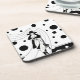 Vintage illustration art deco design featuring a chic lady dressed in a hat and coat and carrying a purse. The woman is walking along a floating path. Black polka dots, circles or bubbles are floating around.