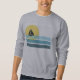 This sweatshirt features a sail boat on water sailing in front of the sun. It has a distinctive mid century modern / retro feel.