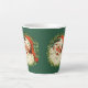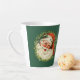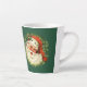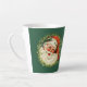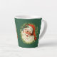 This holiday latte mug has a touch of nostalgia, with a retro image of Santa with his red and white stocking cap and bushy white beard. He wears a sprig of holly with a red berry. The portrait is surrounded by a wreath of pine needles on a forest green background. The image is repeated on two sides.