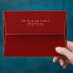 This custom holiday themed envelope in cranberry red has a whimsical vintage santa in long fluffy beard with a sprig of holly held between his toes over a festive red and green tartan plaid pattern on the inside lining of the envelope. A text template is included to personalised the back flap with your return address. These envelopes are a great choice for sending out party invitations, Christmas cards, or other mail during the holiday season.