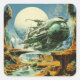 A digital rendering of a retro, vintage science fiction scene with a spaceship.