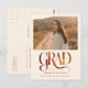 Celebrate your graduate with this elegant photo graduation invitation postcard featuring warm golden tones and modern retro typography. Perfect for a high school or university college grad party, its simple clean chic layout highlights your favourite portrait and event details beautifully. Easily personalise names, date, and location to match your celebration style. Create a trendy class of keepsake and invite guests in style, personalise yours today.