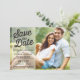 Photo save the date announcement featuring transparent banner with retro typography and a striped background.