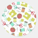 A sticker featuring a sewing themed design consisting of a sewing machine, spools of thread, a pin cushion, scissors, fabric swatches, and sewing needles. Design has a retro orange, yellow, red, and blue / turquoise colour scheme.