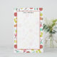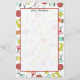 Stationery paper featuring a sewing themed design consisting of a sewing machine, spools of thread, a pin cushion, scissors, fabric swatches, and sewing needles. Design has a retro red, yellow, orange, blue, and turquoise colour scheme.