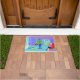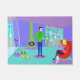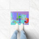 Brrr... This Retro Ski Vacation Door Mat will have you looking around for a Saint Bernard with a cask of brandy. The mid century modern cartoon drawing features a glamourous couple cooped up in a colourful ski chalet with a magnificent view. The room has a turquoise floor and purple walls. Hey, it's the 60s! Floor to ceiling windows reveal snow covered mountains, a turquoise sky with light blue clouds, and the silhouettes of happy people whizzing by in ski lift gondolas. Inside the room, we see an olive green, cone fireplace with a glowing fire. Tossed on the floor are two yellow skis next to ski poles. In the centre of the room, a handsome man with black hair is wearing blue pants and a green turtleneck sweater. He is carrying a tray of martinis. One arm is outreached, offering a martini to a blonde woman's waiting hand. The woman, is sitting in a red, egg chair. She is wearing navy blue pants and a hot pink sweater. Please excuse her for not getting up, but she has a cast on one leg!