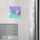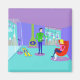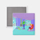 Brrr... This Retro Ski Vacation Magnet will have you looking around for a Saint Bernard with a cask of brandy. The mid century modern cartoon drawing features a glamourous couple cooped up in a colourful ski chalet with a magnificent view. The room has a turquoise floor and purple walls. Hey, it's the 60s! Floor to ceiling windows reveal snow covered mountains, a turquoise sky with light blue clouds, and the silhouettes of happy people whizzing by in ski lift gondolas. Inside the room, we see an olive green, cone fireplace with a glowing fire. Tossed on the floor are two yellow skis next to ski poles. In the centre of the room, a handsome man with black hair is wearing blue pants and a green turtleneck sweater. He is carrying a tray of martinis. One arm is outreached, offering a martini to a blonde woman's waiting hand. The woman, is sitting in a red, egg chair. She is wearing navy blue pants and a hot pink sweater. Please excuse her for not getting up, but she has a cast on one leg!